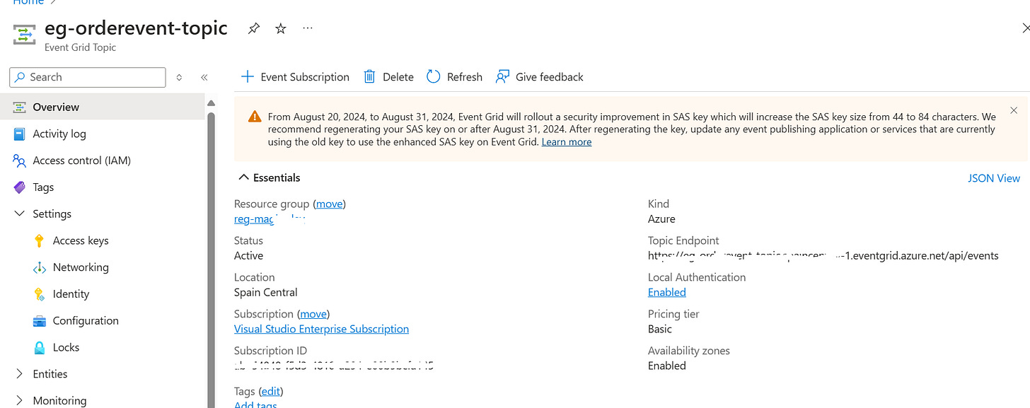 Note the Topic Endpoint and Key for authentication. (found in Settings/Access Keys)