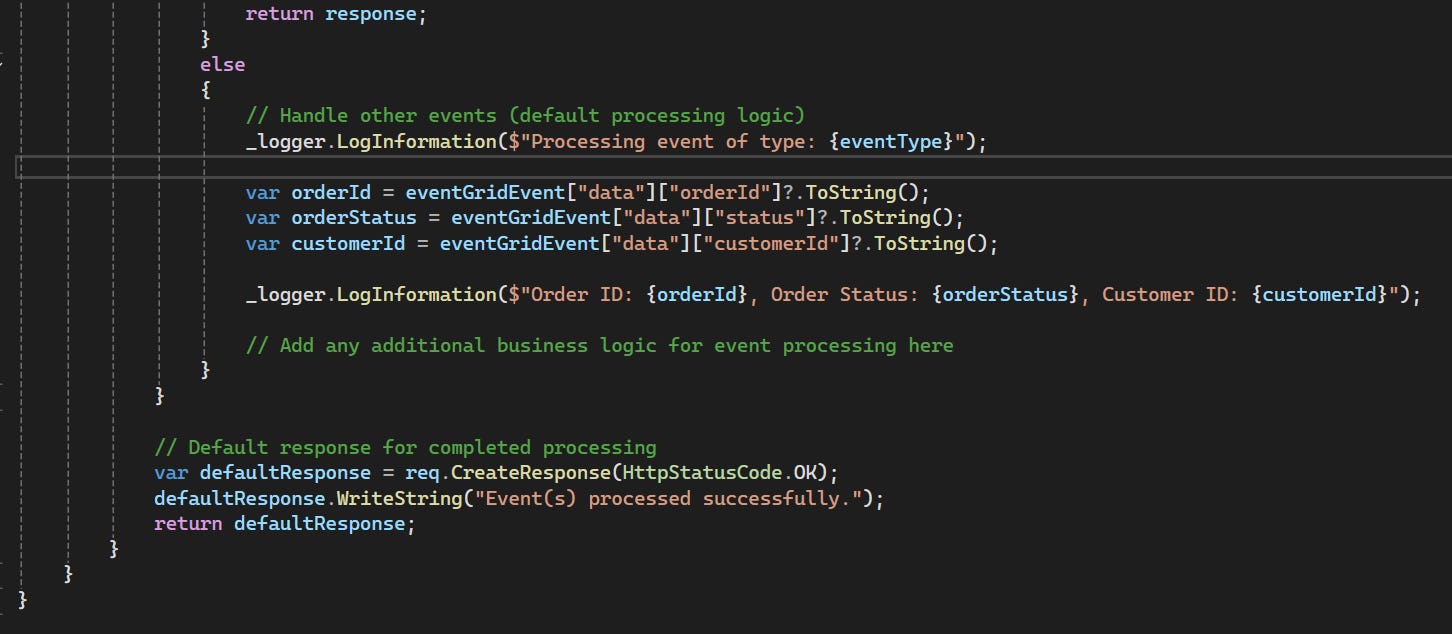 Notice that the Azure Function contains extra code before handling the actual request. This is because of Event Grid web-hook validation.