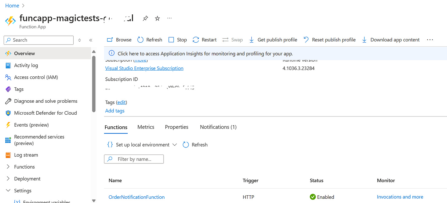 Finally. Check that it Event Grid publishes this message to the web-hook URL (Azure function). We can easily confirm this from the Function App’s log stream: