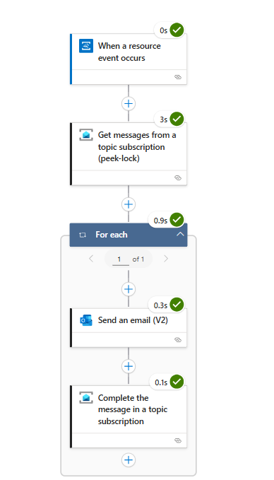 Select a logic app run to see the details. Notice that it processed five messages in the for loop.