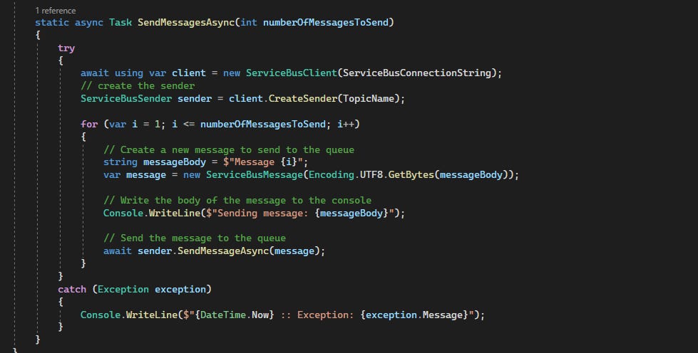 If you haven't already sent test messages to the topic, use the code in the step 2 to send test messages to the Topic.