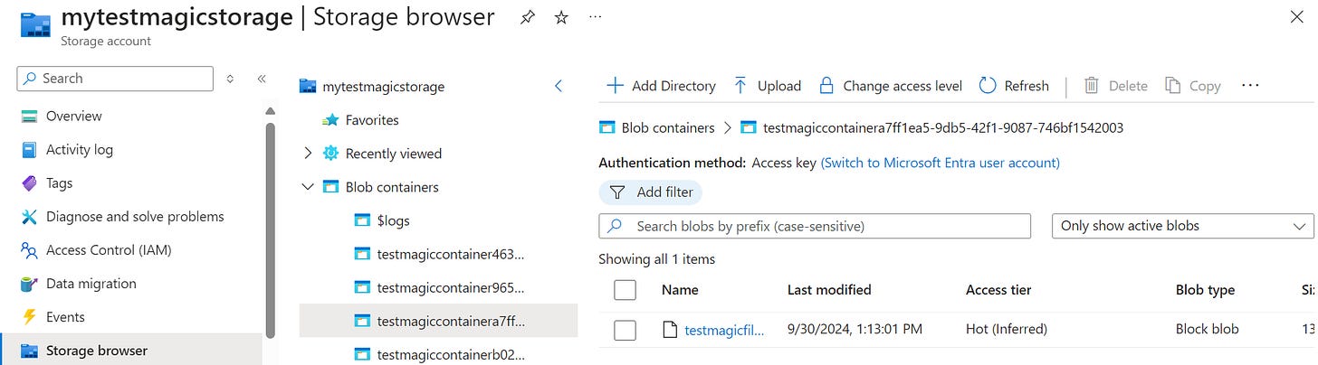 To see the container & uploaded blobs, Navigate to Storage account → Storage browser → Blob containers